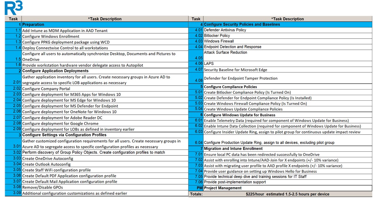 Desktop Software Standardization and Software Licensing and Upgrades R3 will work with the client’s team(s) to identify the specific roles within the organization. With that information, R3 will develop standard desktop images for each role within the organization and document the required applications for each. All software upgrades and deployments are managed by Microsoft Intune and deployed as the updates become available from their perspective companies.