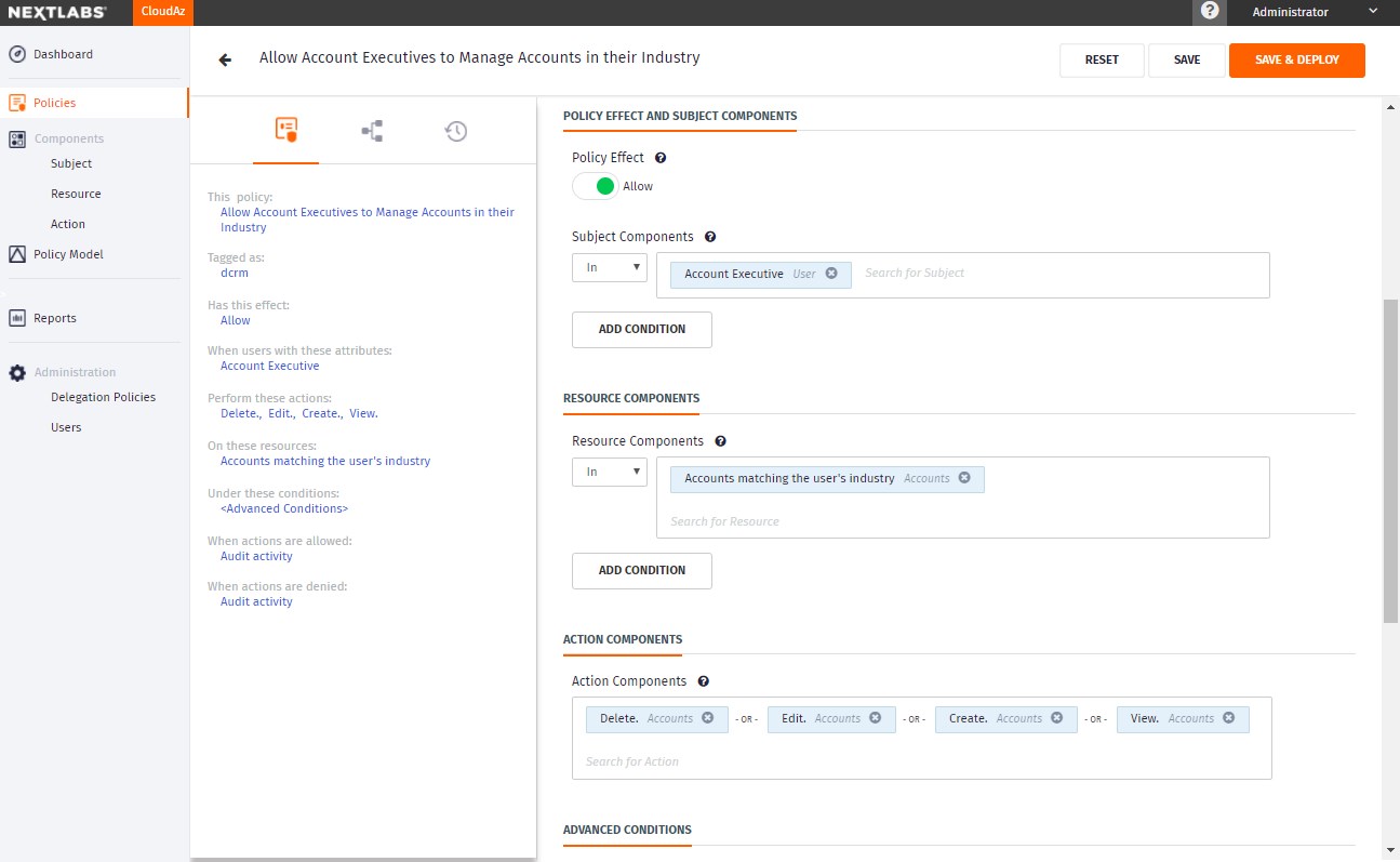 Control access to data and business transactions through human readable business rules. A simple policy may state that account executives can view and edit accounts, leads, and opportunities that belong to the industry, region, and size of company the user is responsible for.
