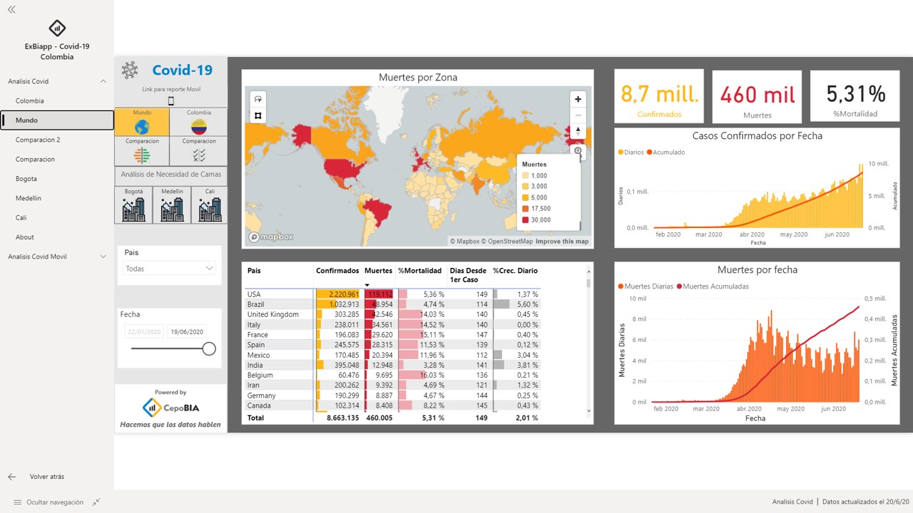 Propuesta de valor: Analice la propagación del COVID-19 en Colombia y compáralo con la propagación en el resto de mundo en un informe Power BI actualizado diariamente.
